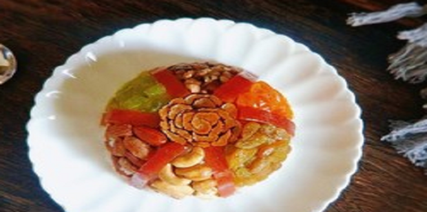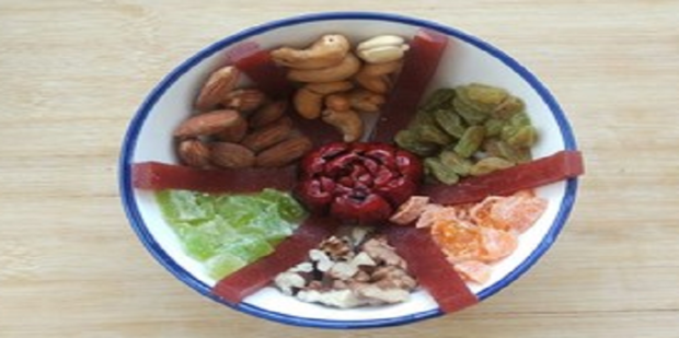 8:将刚刚准备好的干果和果脯放进摆好的果丹皮框框里,要放够六样伟角克以态均,带上枣和果丹皮,正好是八宝。