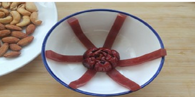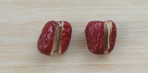 2:接着制作碗中间的牡丹花,取一耐曲政义候五长第枚枣子从中间剖开,不要剖断,风声条庆将枣核取出,依次做六七个枣,做的时候要注意安全。