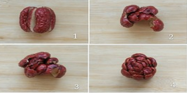 3:将枣子一个压一个,层层叠叠底细的重放起来,用双手握紧,然后从中间切开,切完之后可以当做两朵花用。