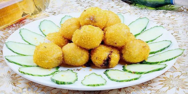 2 | 将汤圆裹上面来自包糠,也可不裹。放入汤圆。注意,在油炸的时候手拿一根牙签在每个汤圆上面扎小孔,以便高热的气体能从密闭的汤圆里面放出来。不然汤圆会炸哦,炸哦,炸裂哦!