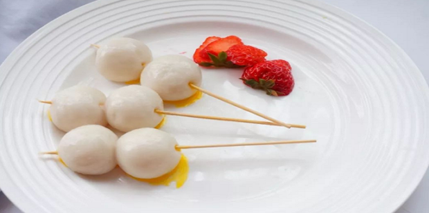 2 | 出锅用竹签串起来,串起来让内陷流出来,切一个草莓点缀摆盘!流出来的内馅儿感觉更有食欲呢!