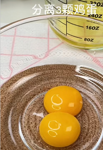 1:准备三颗鸡蛋,将蛋黄与蛋清分别装在两个盆中。