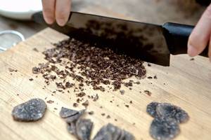2、将黑松露在清水下用毛刷洗去泥土,并用刮刀刮去黑松露表皮,去皮后的黑松露切片,表皮研磨成粉末状。