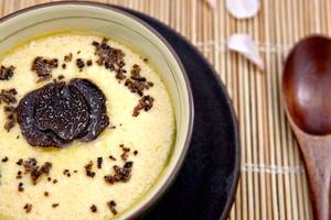 4、蒸锅水开后,放入蒸碗,加上盖子,转文火,蒸8分钟,放入黑松露片,盖上盖子,用余温焖1分钟既即可。