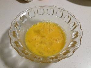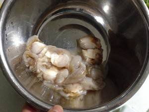 3、红贝去壳汆水,放到打好的鸡蛋里拌匀。