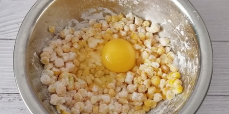 2、玉米煮熟取粒,取粒用叉子。冲洗控水,加一个鸡蛋,玉米淀粉适量,调匀。