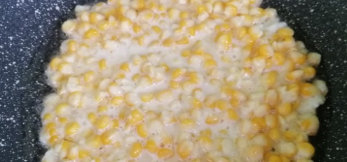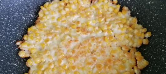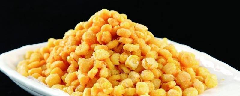 3、锅里倒油加热七八成热,倒出一部分,转中小火,倒入玉米,油刚没过玉米就好。整个过程不要搅动玉米,让玉米自然成型。可轻轻晃动锅,避免沾底。