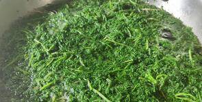 3、锅中加盐、食用油,倒入米蒿翻炒至变色,捞出晾凉。
