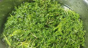 2、米蒿摘去枯叶、根部,用盐水浸泡十分钟再淘洗干净。