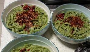 3、面团擀成面片煮熟,控干水分放进碗里。