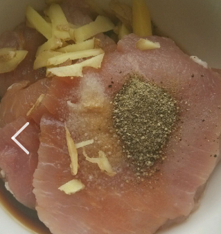 1、准备食材:猪大排、一品鲜酱油1小勺、绍兴黄酒1小勺、食盐2g、生姜10g、黑胡椒粉1/2小勺、普通面粉、面包糠、鸡蛋1个、底油适量。