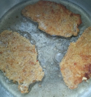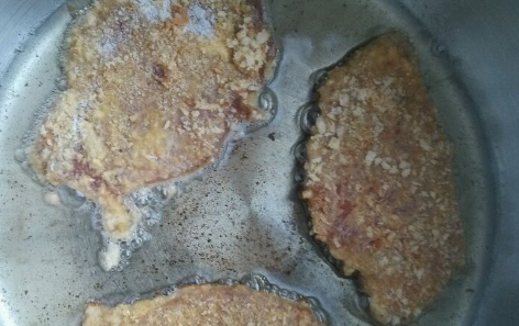 9、捞出,沥干油。把煎好的猪排,重新放入锅里再煎一遍。捞出,沥干油,切成条状,即可享用。