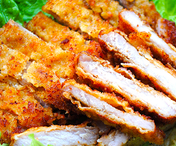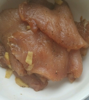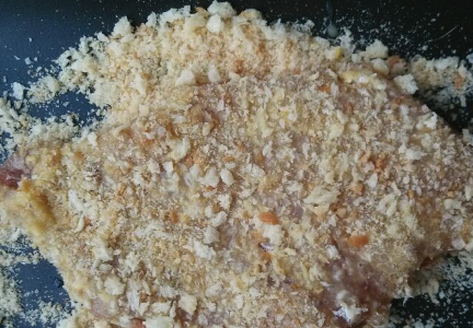 6、把沾有面粉的肉片放鸡蛋液里滚一圈。再把裹一层蛋液的肉片放入面包糠中,裹一层。