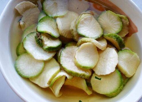 2、把萝卜干洗净,用凉水浸泡2小时以上,捞出后洗净切片。