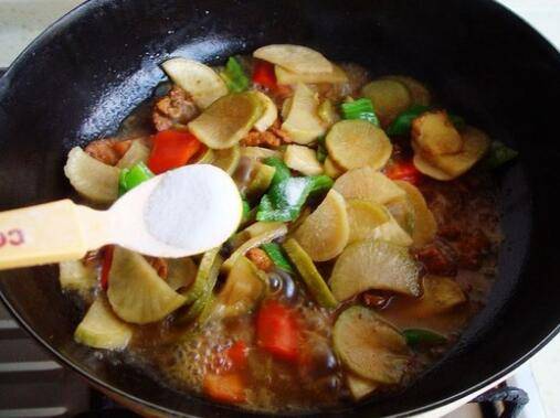 5、加八角、姜末、料酒、老抽、萝卜干翻炒均匀,加水大火烧开。
