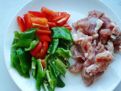 3、把猪肉洗净切块,青红辣椒洗净切块,姜切末。