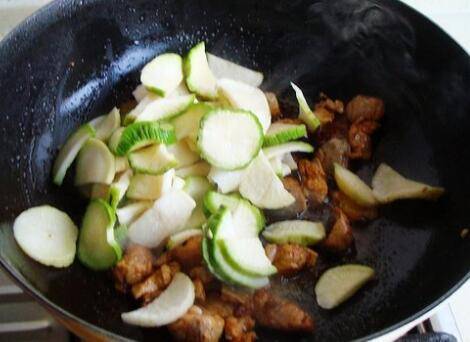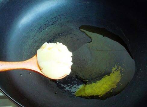 4、热锅凉油,加鸡油烧到7成热,加猪肉翻炒均匀。