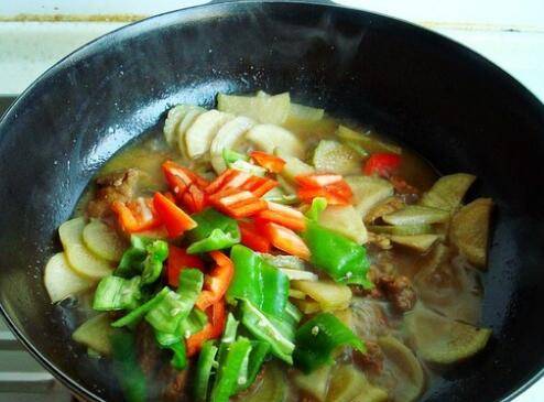 5、转中小火焖烧20分钟左右,加青红辣椒翻炒均匀。
