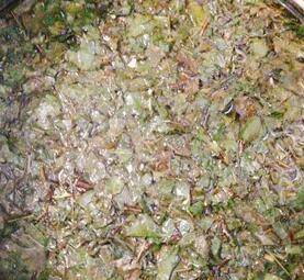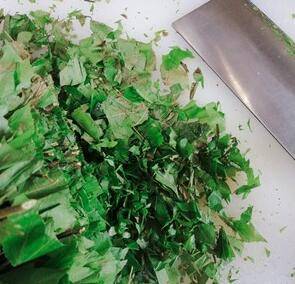 2、将枫叶全部剁碎,放在锅里搓30分钟。