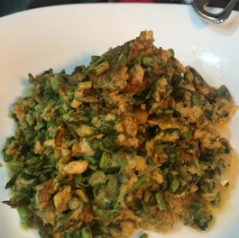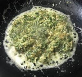 3、热油(适量,别太多,以免鸡蛋吃油太多而油腻)下椿芽鸡蛋液,煎至表面略凝固后翻面,煎至两面金黄熟透。