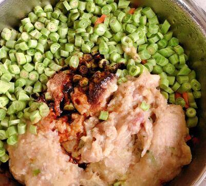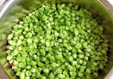 2、豆角切碎,肉适量,葱和姜都可以根据自己的口味加。