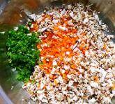 2、把胡萝卜、香菇、青椒、鸡胸肉剁碎备用。
