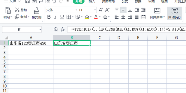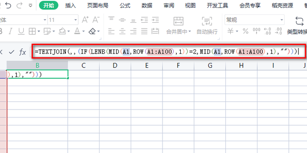 =TEXTJOIN(,,(IF(LENBOW(A1:A100),1))=2,MID(A1,ROW(A1:A100),1),击“Ctrl + Shift +