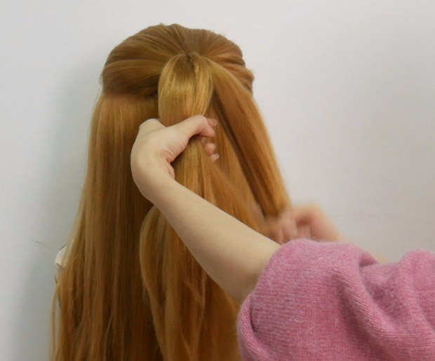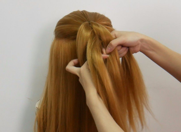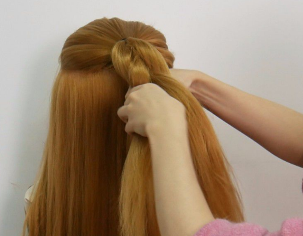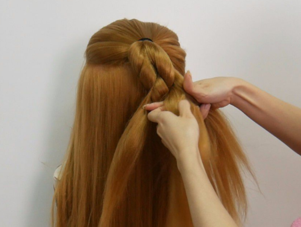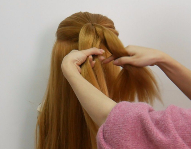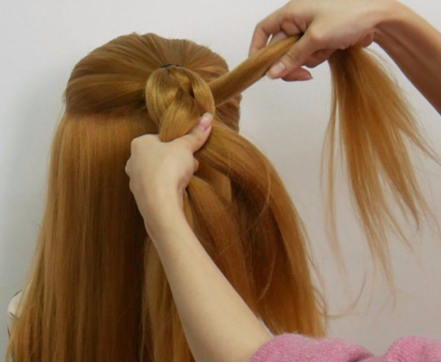 3:将第1股头发往下绕到第2股下面。