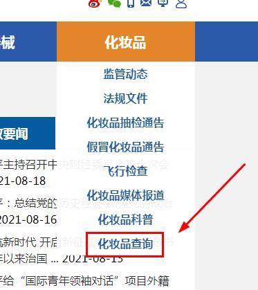 3:进入官网后在菜单栏找出来一系列子类目,找到【化妆品查询】并点击进入。