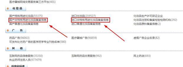 4:在主页中找到【化妆品】一栏,了解一下自己想要查询的化妆品的国产的,如果是进口的就点击【进口非特殊用途化妆品备案信息】;如果是国产的就点击【国产非特殊用途化妆品备案信息】。
