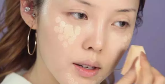 2:在额头、脸颊、颧骨、下巴、鼻翼、嘴角轻轻点涂上适量的粉底液外轻轻拍开粉底液,翼、眼睑、嘴角部分的粉底液涂开。