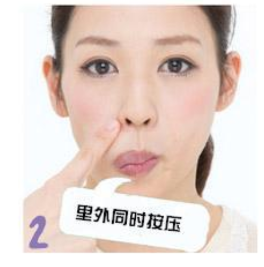 2:用舌头挤压口腔挤压的部位,同时用食指从外侧施压,按住相同的部位,这个动作坚持5秒,左右各进行3次联系,要从法令纹先开始,然后轻轻按压到鼻翼两边的肌肉。
