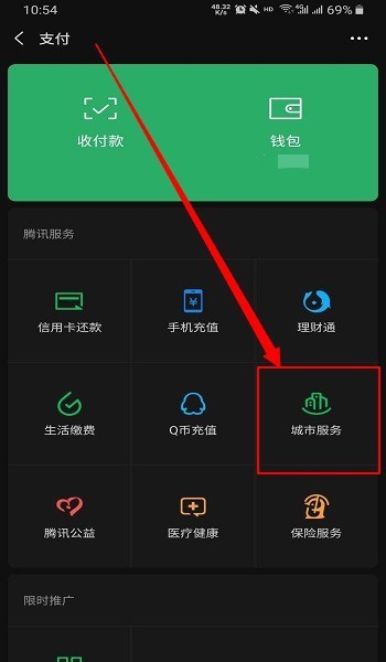 2:在支付对话框中找到“城市服务”点击进入