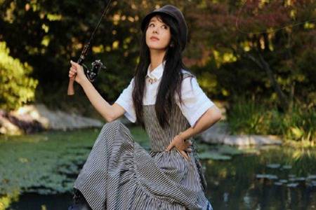 大片之中,斑驳树影下,女神赵丽颖化身森林精灵,黑白条纹吊带裙,内搭白色短袖衬衫,头上戴上一顶黑色皮质贝雷帽,手里还拿着鱼竿,一副鬼马少女的既视感。