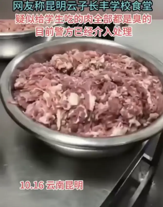 近日,昆明市官渡区长丰学校的一名家长曝光了一则视频,称孩子在学校吃饭后出现了拉肚子的现象。家委会组织家长去食堂检测,结果发现食堂居然在使用2014年巴西进口冷冻肉,而且还几盆炒菜的肉都是臭的。