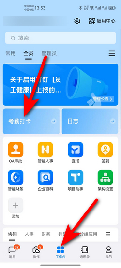 1:首先在工作台中点击考勤打卡。