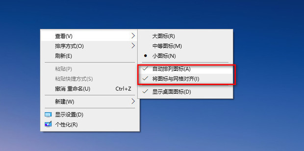 2:选择查看下的自动排列图标和将图标与网格对齐。