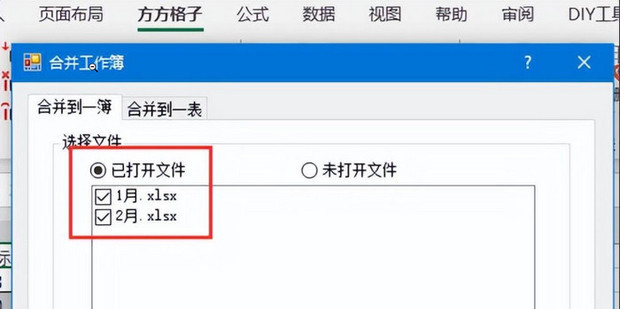 5:勾选【已打开文件】,选择要合并的两个工作簿。