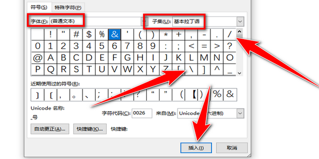 3:将字体设置为普通文本,子集设置为基本拉丁语,选择斜杠的符号,点击插入即可。