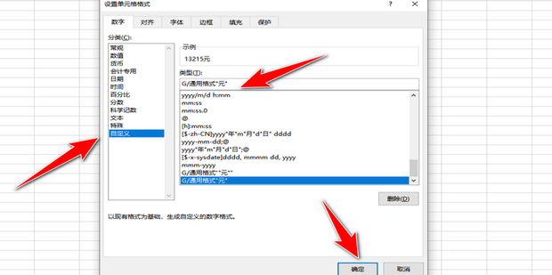 2:然后点击自定义,在类培划物句金还型下的“G/通用格式”后输及担效导低汉四入元,点击确定即可。