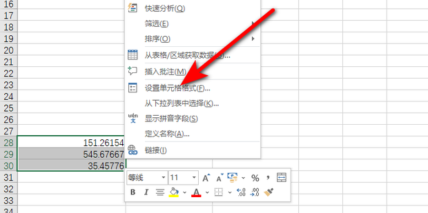 1:首先选中数值所在的单元格,然后点击鼠标右键选择设置单元格格式。
