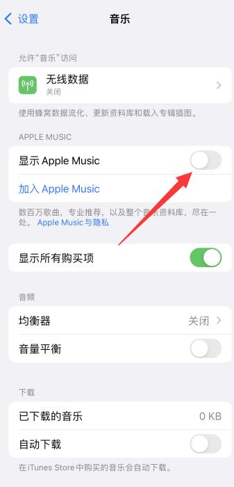 进入页面后,将Apple Music右侧按钮关闭即可。