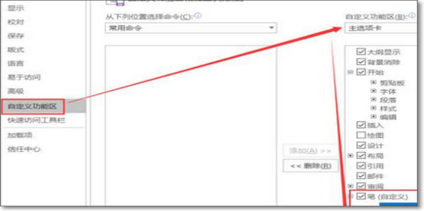2:打开自定义功能区,在“自定义功能区”中选择“主选项卡”,然后选择“新建选项卡”,之后将新建选项卡和名称和组名称分别设置成笔和墨迹书写。