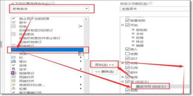 3:将“从下列位置选择命令”设置为“所有命令”,然后在下方列表中找到“开始墨迹书写”选项,选中他之后选择右侧“墨迹书写(自定义)”按钮然后选择添加,之后点击“确定”即可。