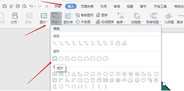 6:点击上方插入点击形状选择矩形。