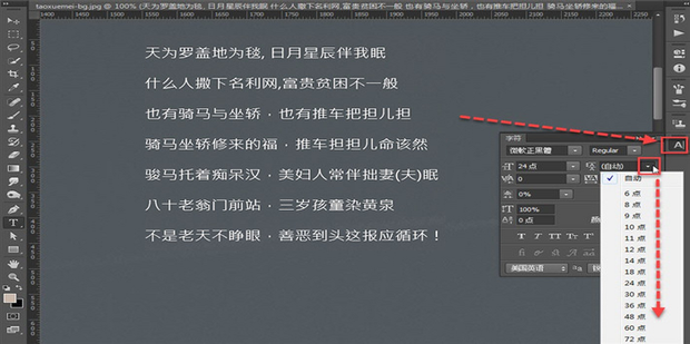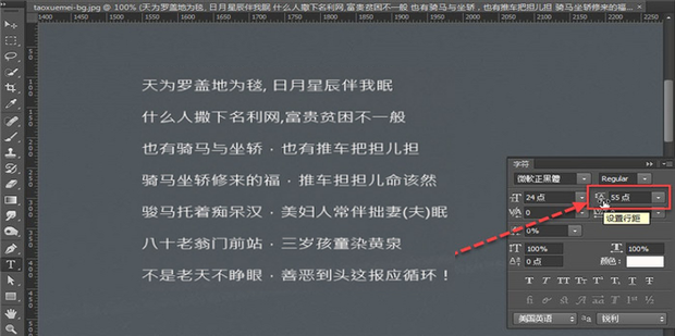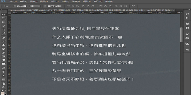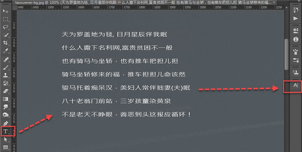 1:下图中为ps工作界面上的一段文字,是用了一个图空屋层,也就是通过文字工具,粘贴上的文字,此时需要把这段文字的行间距增大,操作方法来自是点击右侧工具栏上的【字符】图标。