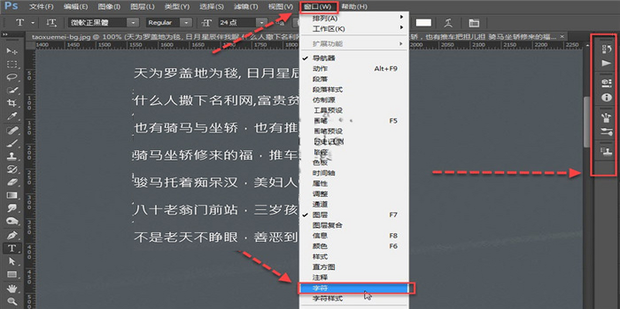 2:如果右侧栏上没有字符图标,可以点击界面上方菜单栏【窗口】,下拉菜单中点击【字符】后,即可显示出来。