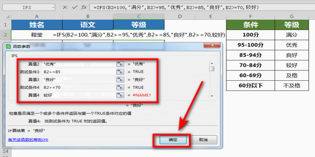 5:结合右表在参数中输入:(B片若矿2=100,”满分”,B2>=95,”优秀”,B2>=85,”良好”,B2>=70,”较好”,B2>=60,”及格”,B2<60,”不及格”)。点击确定。