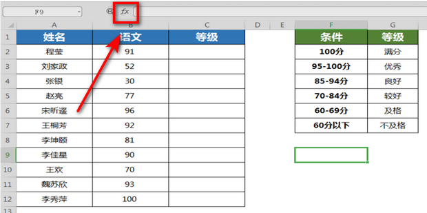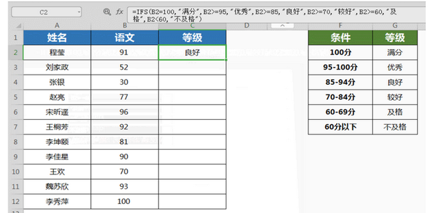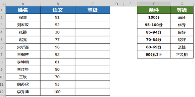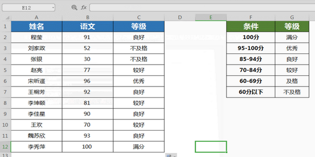 1:IFS函数可以用来做多条件判定工作。以下表左侧这个成绩表为例,现在需要判断学生成绩等级,判定条件如下表右侧所示。