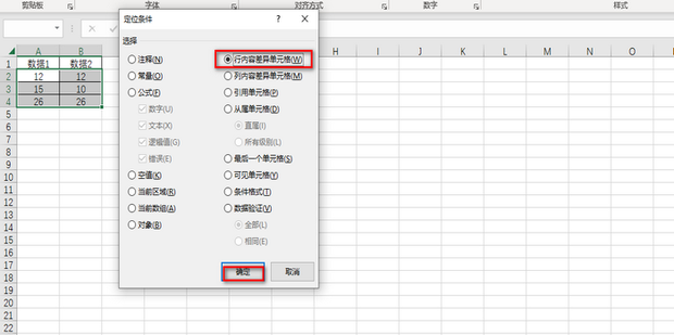 5:然后来自选中行内容差异单元格,之后点击确定。
